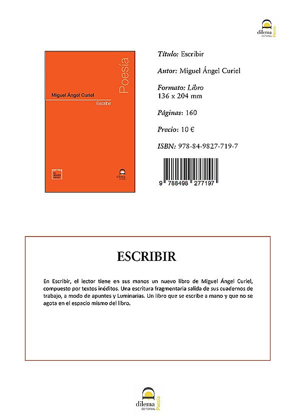 En Escribir, el lector tiene en sus manos un nuevo libro de Miguel Ángel Curiel, compuesto por textos inéditos. Una escritura fragmentaria salida de sus cuadernos de trabajo, a modo de apuntes y Luminarias. Un libro que se escribe a mano y que no se agota en el espacio mismo del libro.